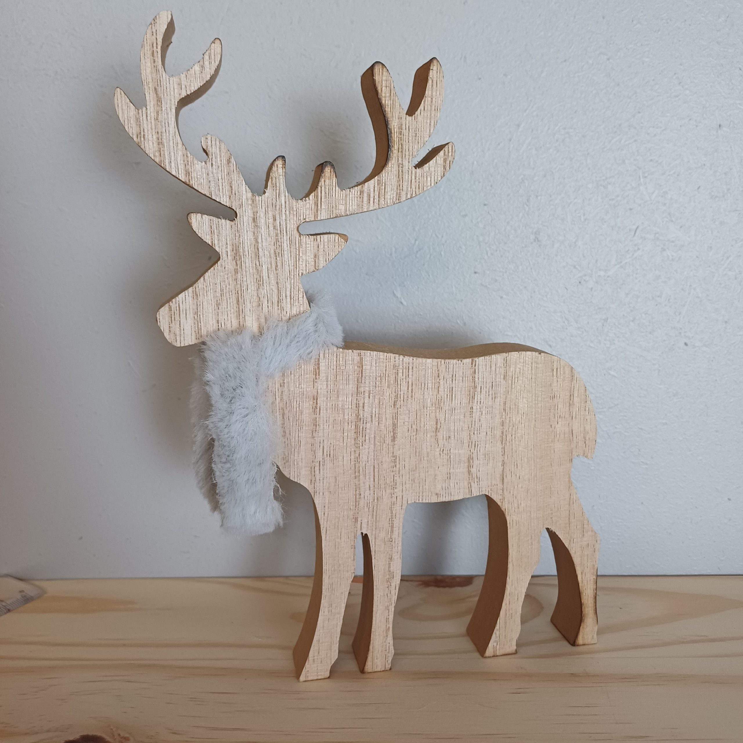Cerf décoratif en bois à poser avec écharpe fourrure synthétique grise.