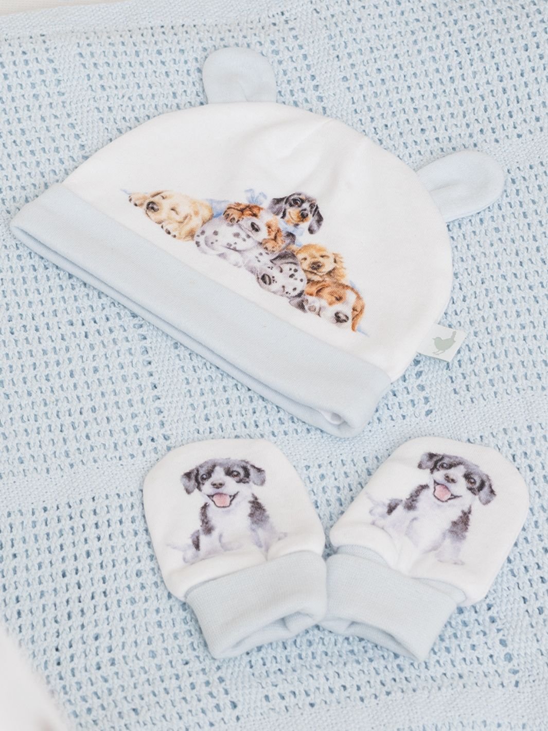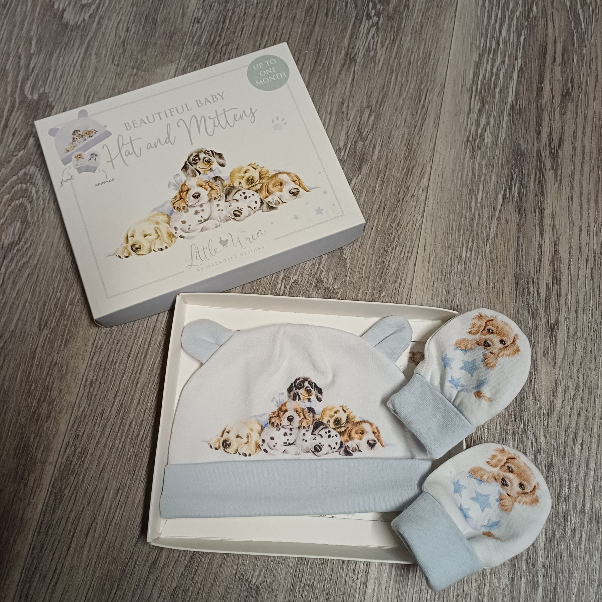 • Wrendale Designs Hannah Dale Little Forest Ensemble bonnet et gants pour nouveau-né Motif Chiens Comprend des moufles super douces et un bonnet avec oreilles. Présenté dans une boîte cadeau illustrée. Fabriqué en 100 % coton, poignets 98 % coton, 2 % élasthanne. Taille unique, convient aux nouveau-nés.